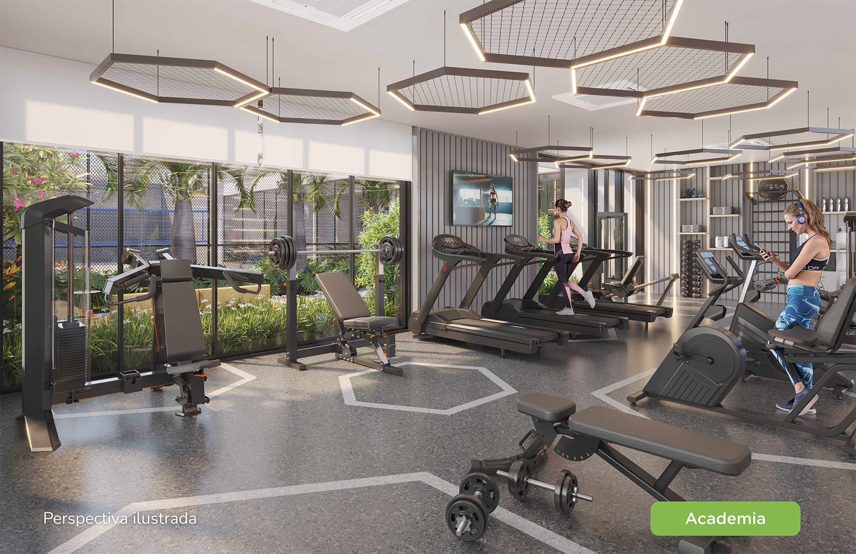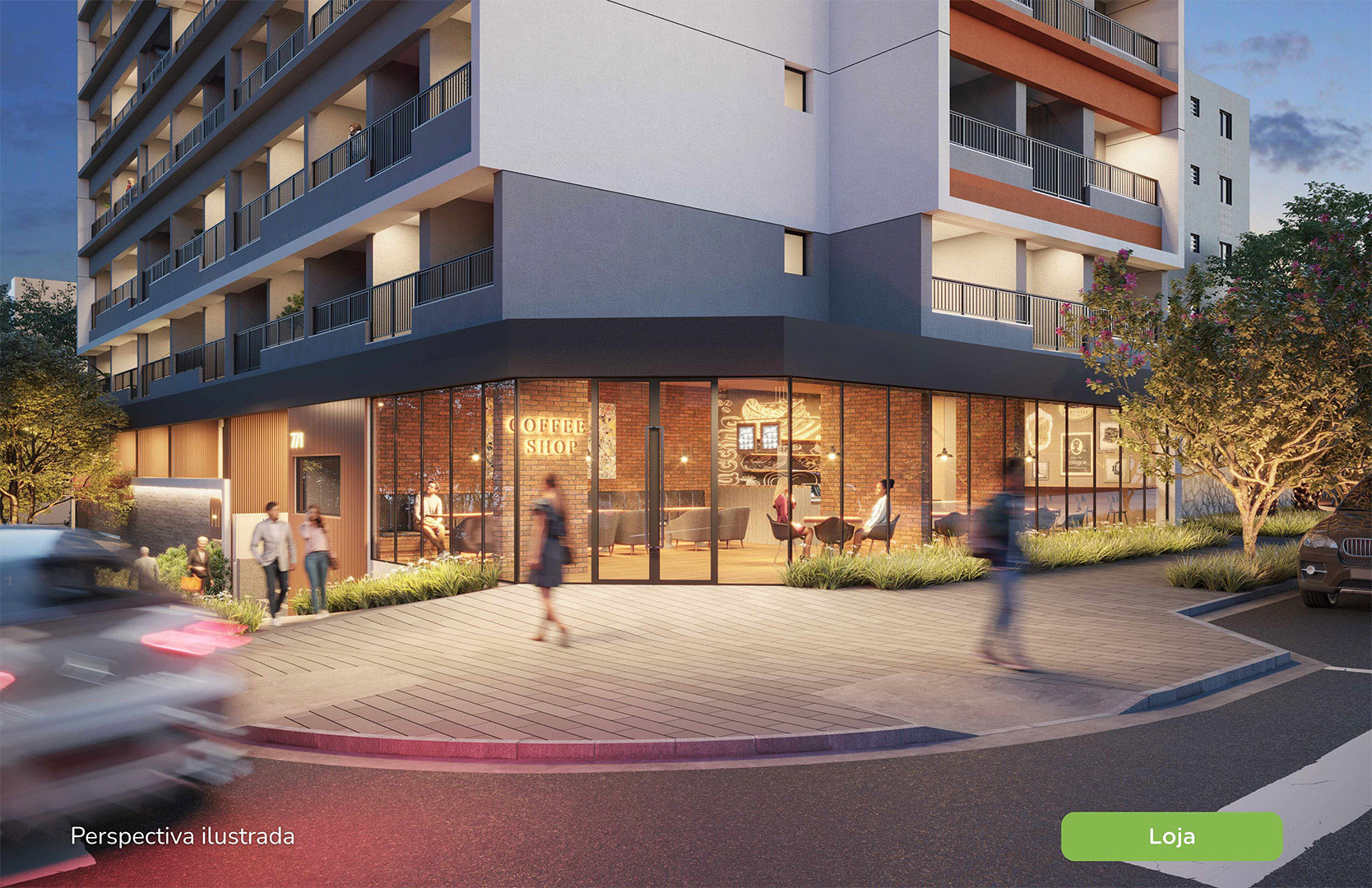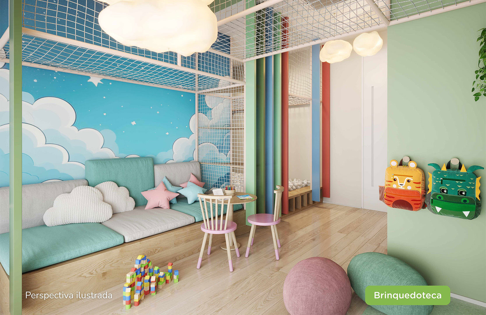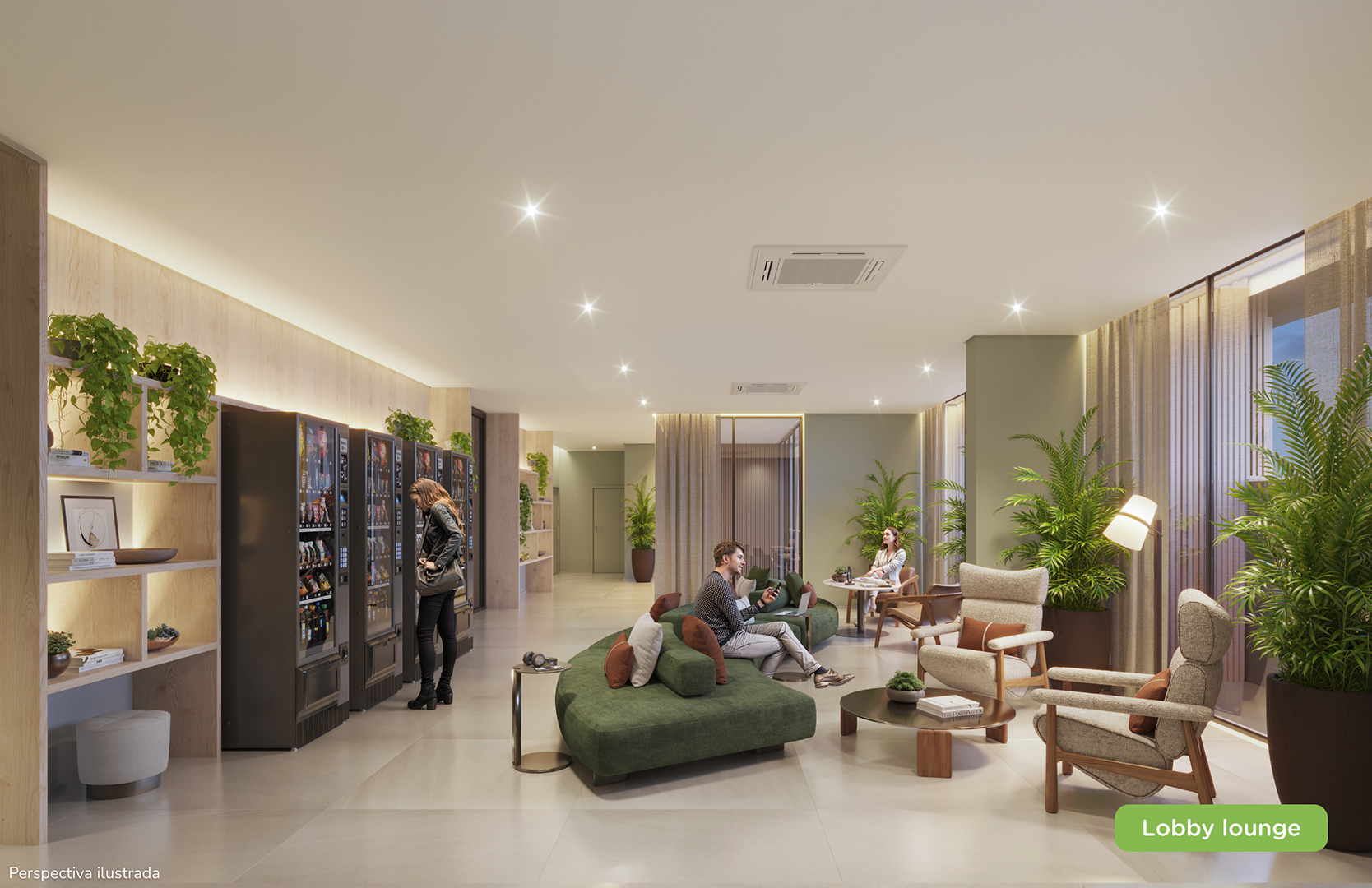 Térreo: Lobby Lounge, Mercado de uso interno, Coworking, Sala de reuniões, Phone Booth, Brinquedoteca, Fitness, Salão de Festas, Delivery, Guarita Blindada