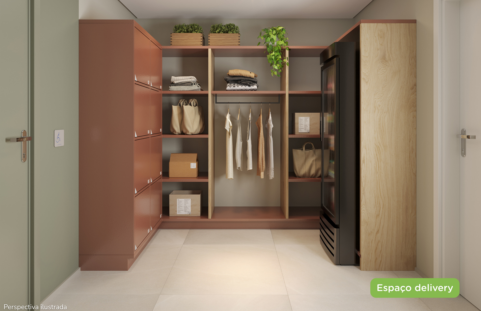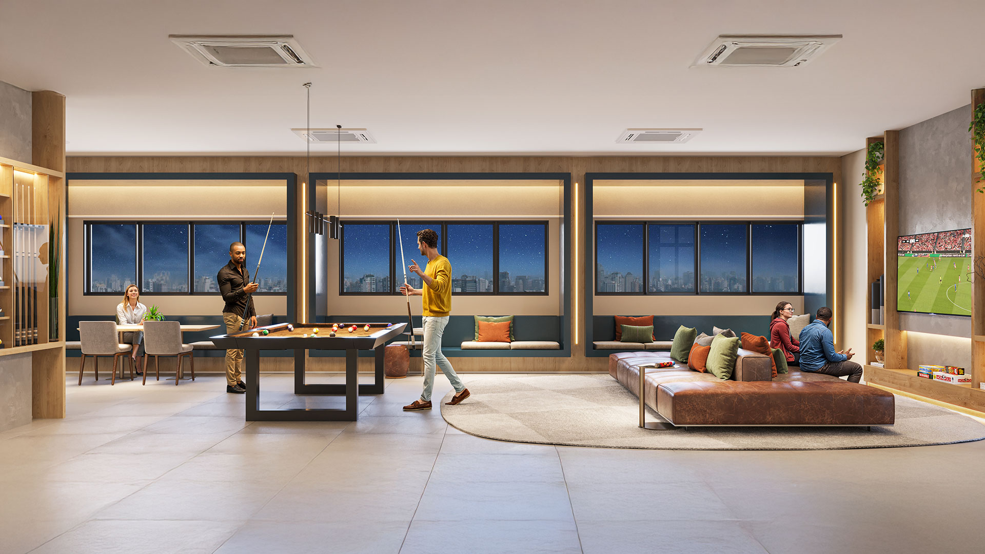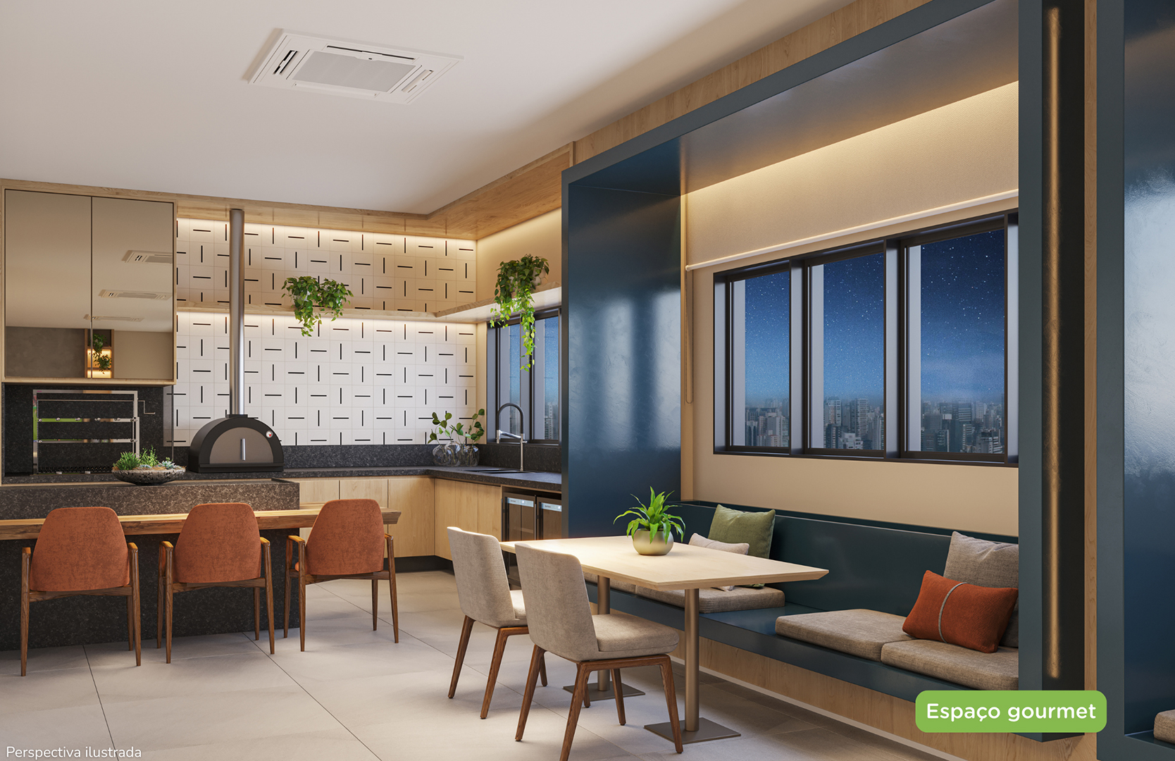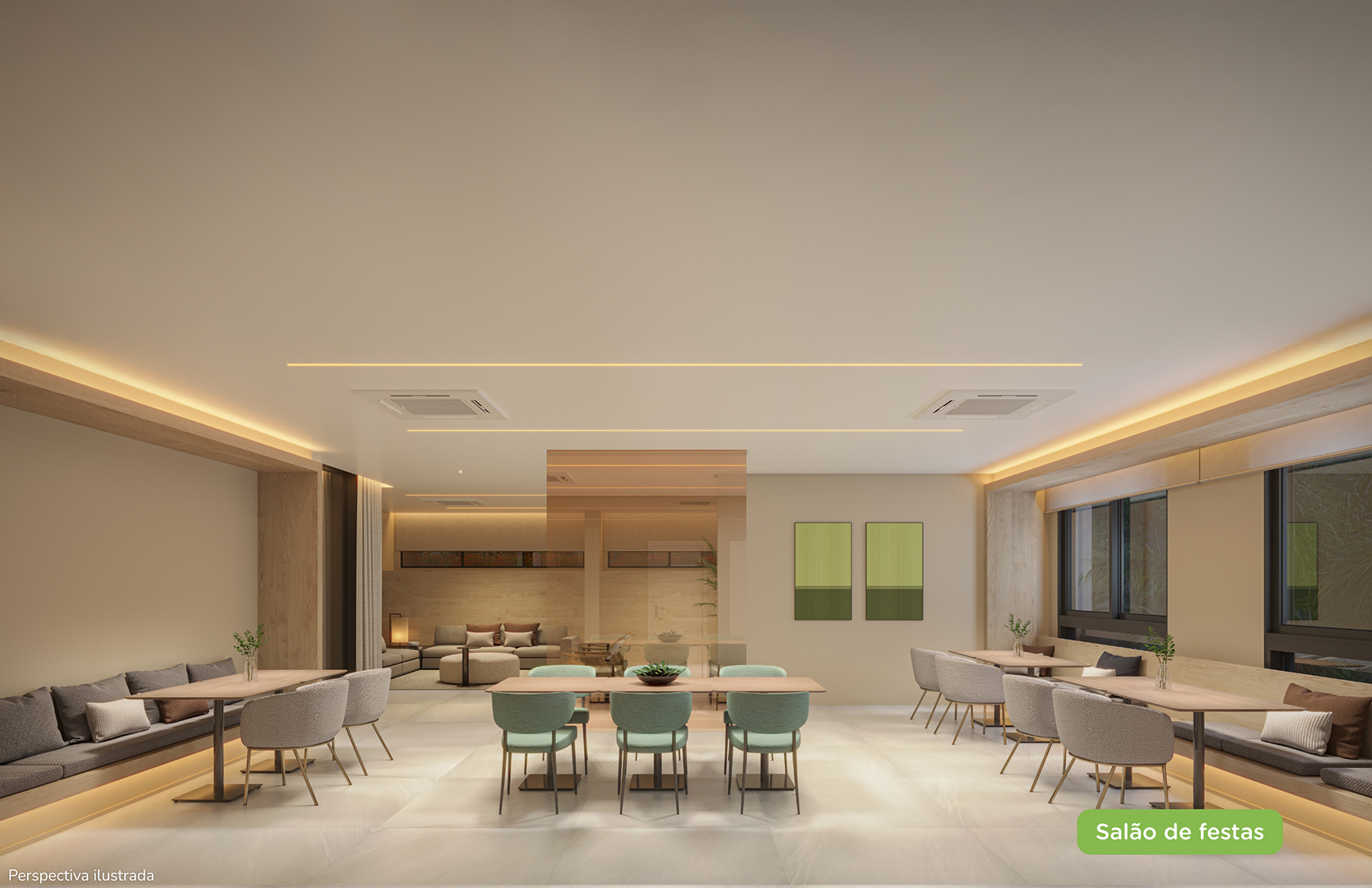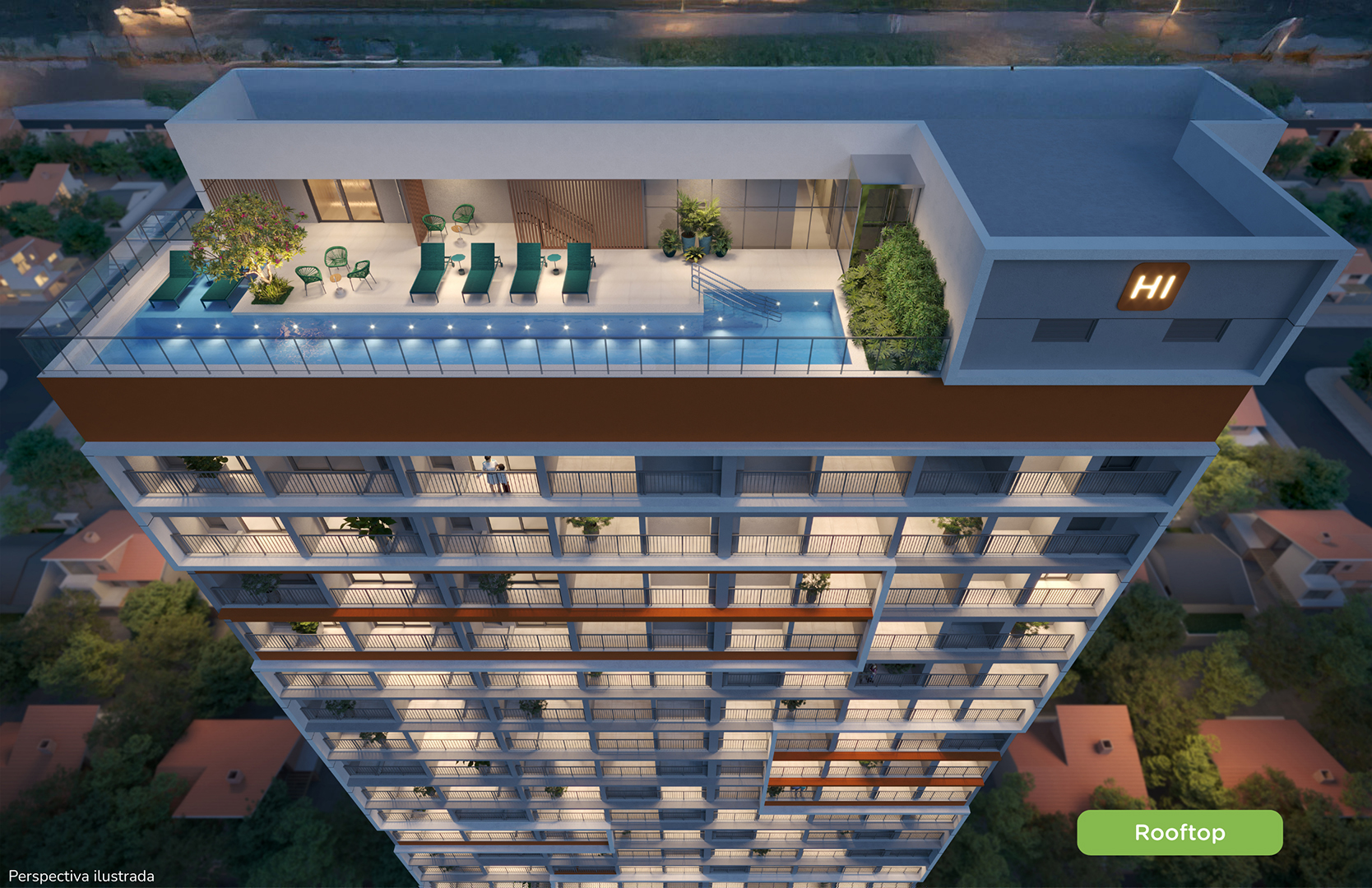 Térreo: Lobby Lounge, Mercado de uso interno, Coworking, Sala de reuniões, Phone Booth, Brinquedoteca, Fitness, Salão de Festas, Delivery, Guarita Blindada
